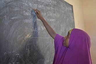 In step 3 in level 2, participants practice solving numeracy problems similar to the one presented in the theme text. First they work together on the chalkboard, then individually in the notebooks.